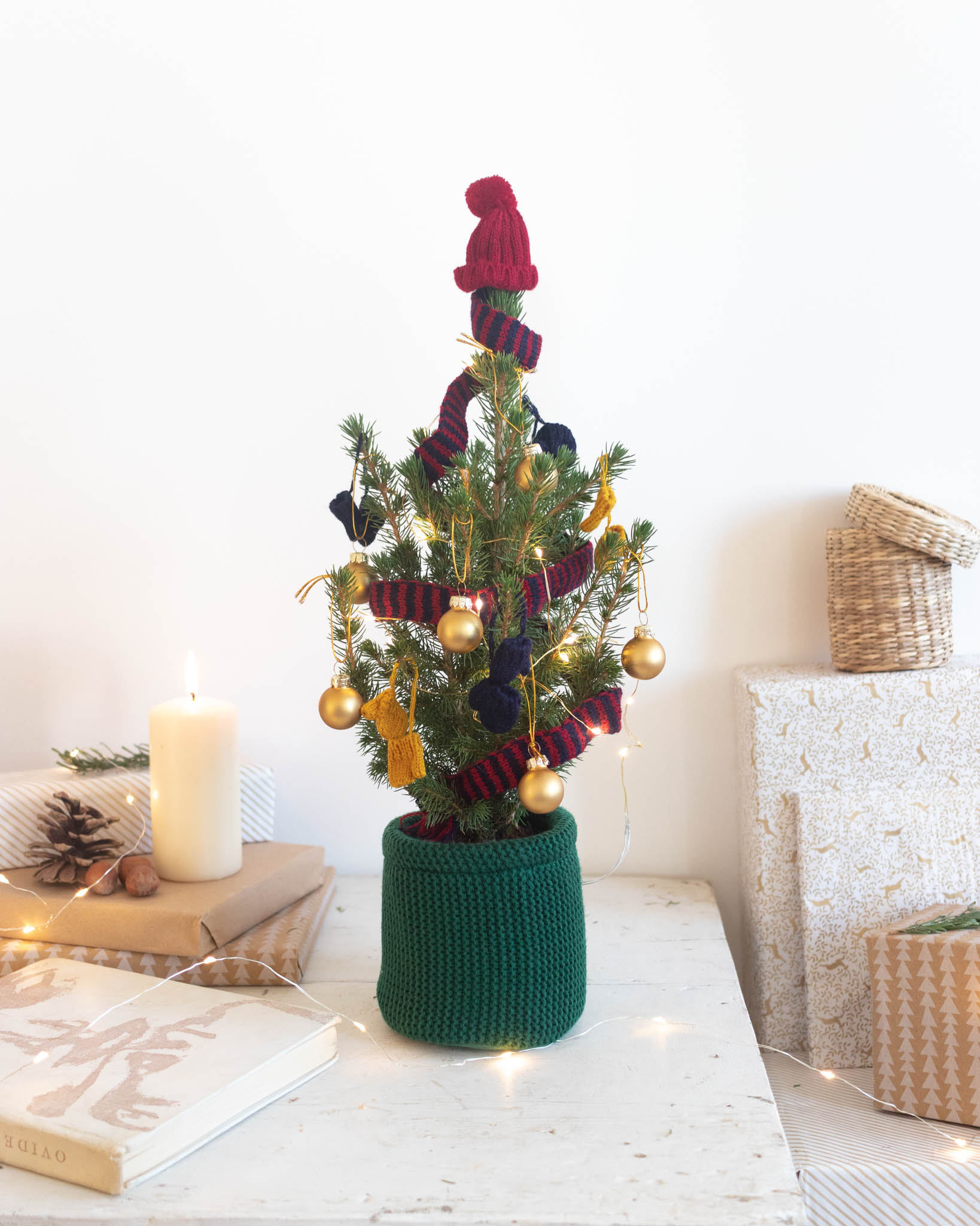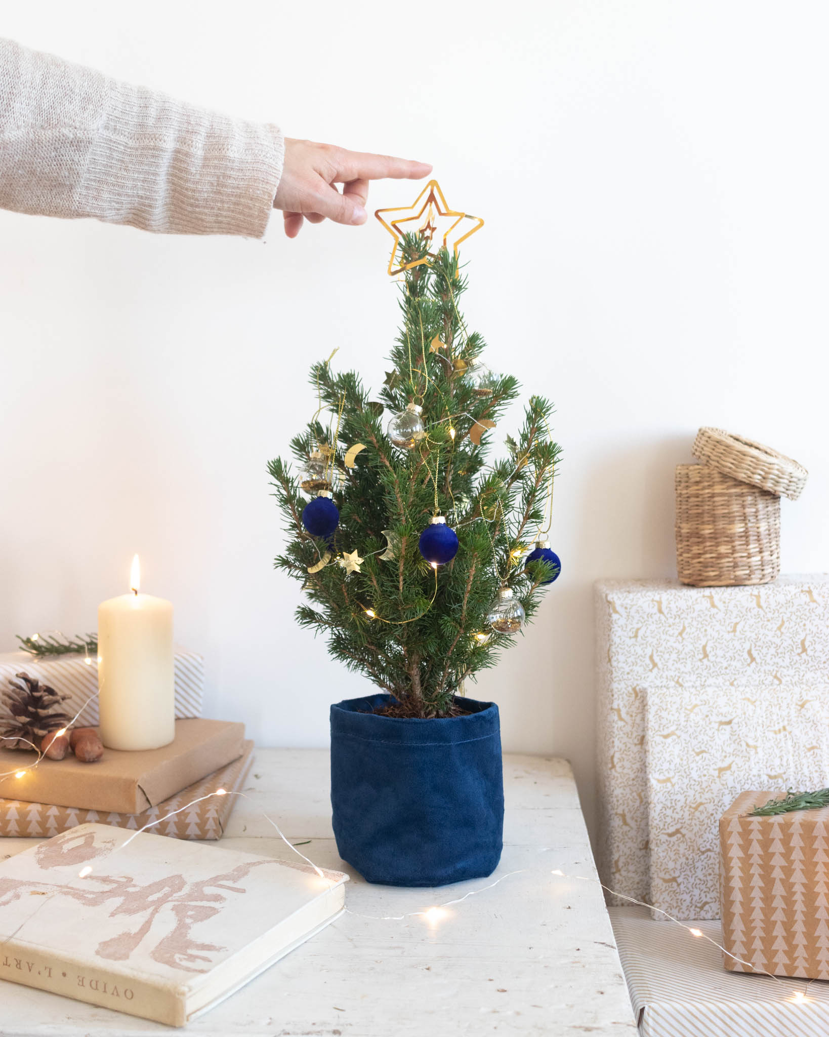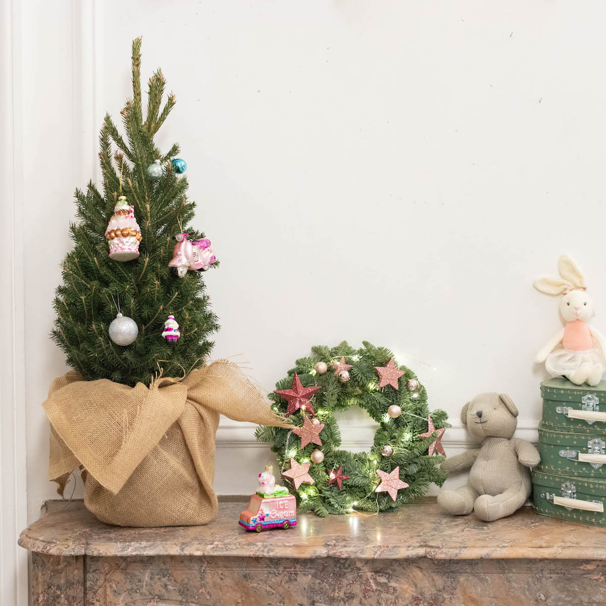 Deux tout petits épicéas et leurs décorations originales, à poser sur une table, une commode ou encore dans un petit bureau. C’est promis, ces mini sapins de Noël enchantent comme des grands !
