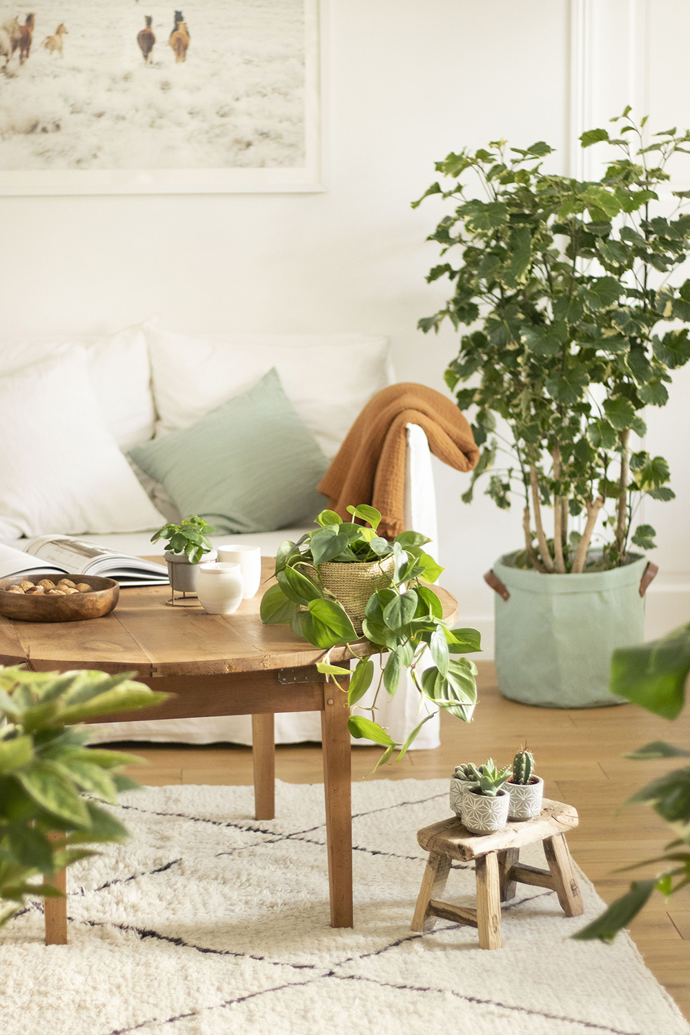Pour faire de l’effet dans votre salon, accueillez un Ficus Lyrata ! Cette grande plante d'intérieur est en réalité un véritable arbre d’intérieur ! C’est une plante indémodable que l’on retrouve dans de nombreuses habitations. Avec son beau feuillage, elle habille l’espace avec élégance : une jolie déco tout en hauteur ! Placez votre Ficus Lyrata dans un beau panier en rotin ou en osier près de votre canapé.